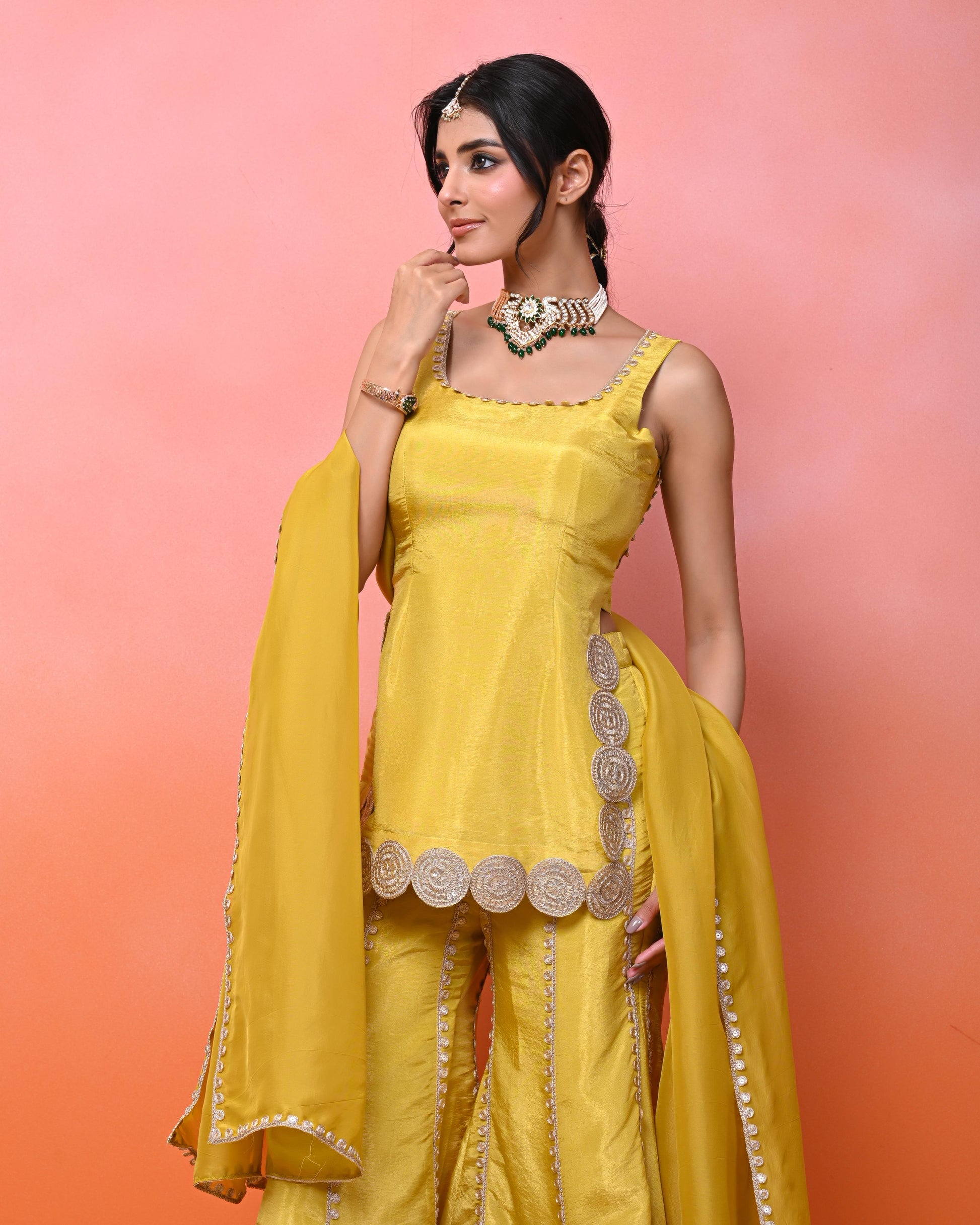Experience traditional elegance with our yellow tissue Cosmo Sharara Set. Featuring an asymmetrical hem, intricate detailing, and a paired organza dupatta, this set is perfect for any occasion. The sharara adds an extra touch of sophistication. Elevate your wardrobe with this stunning ensemble.