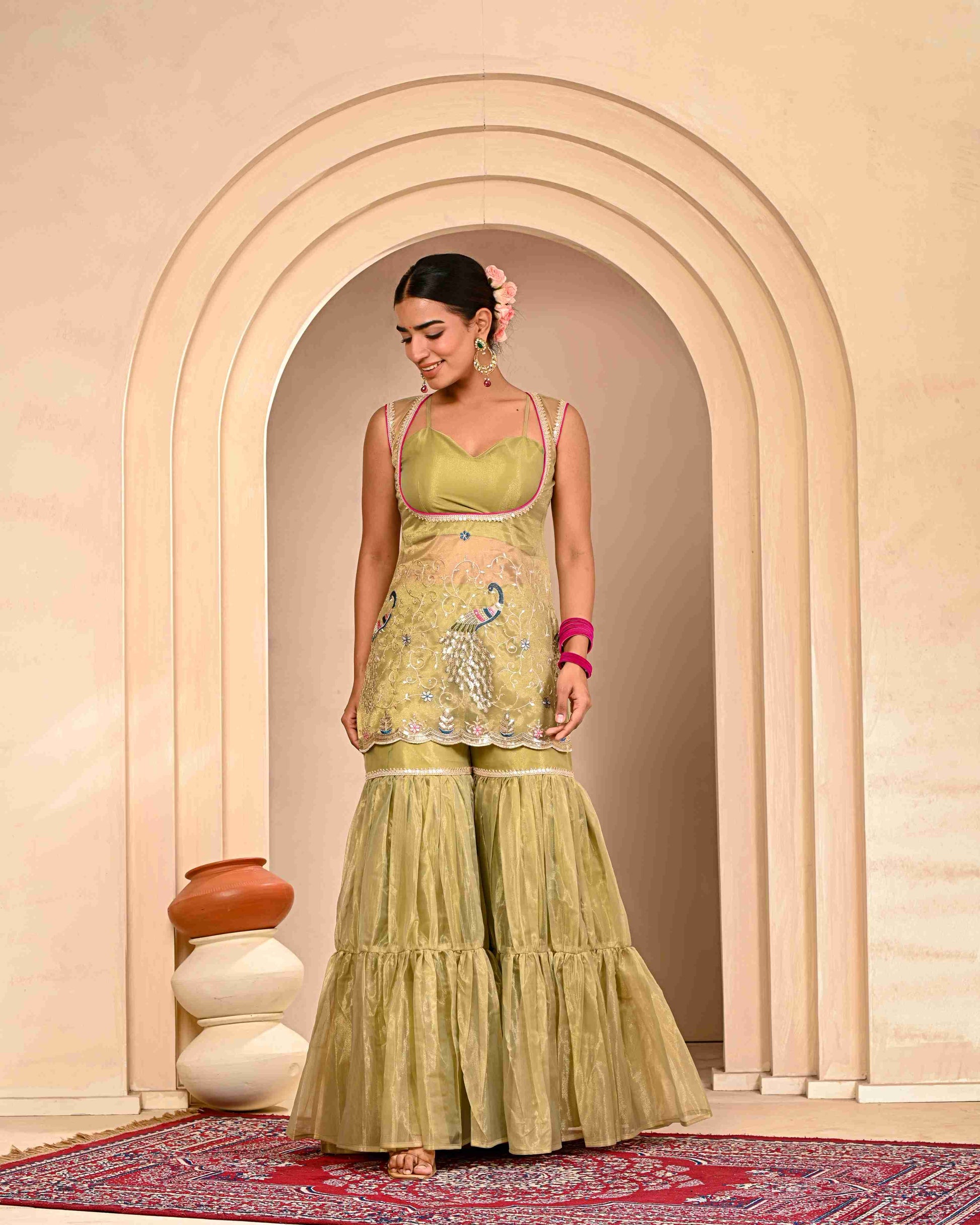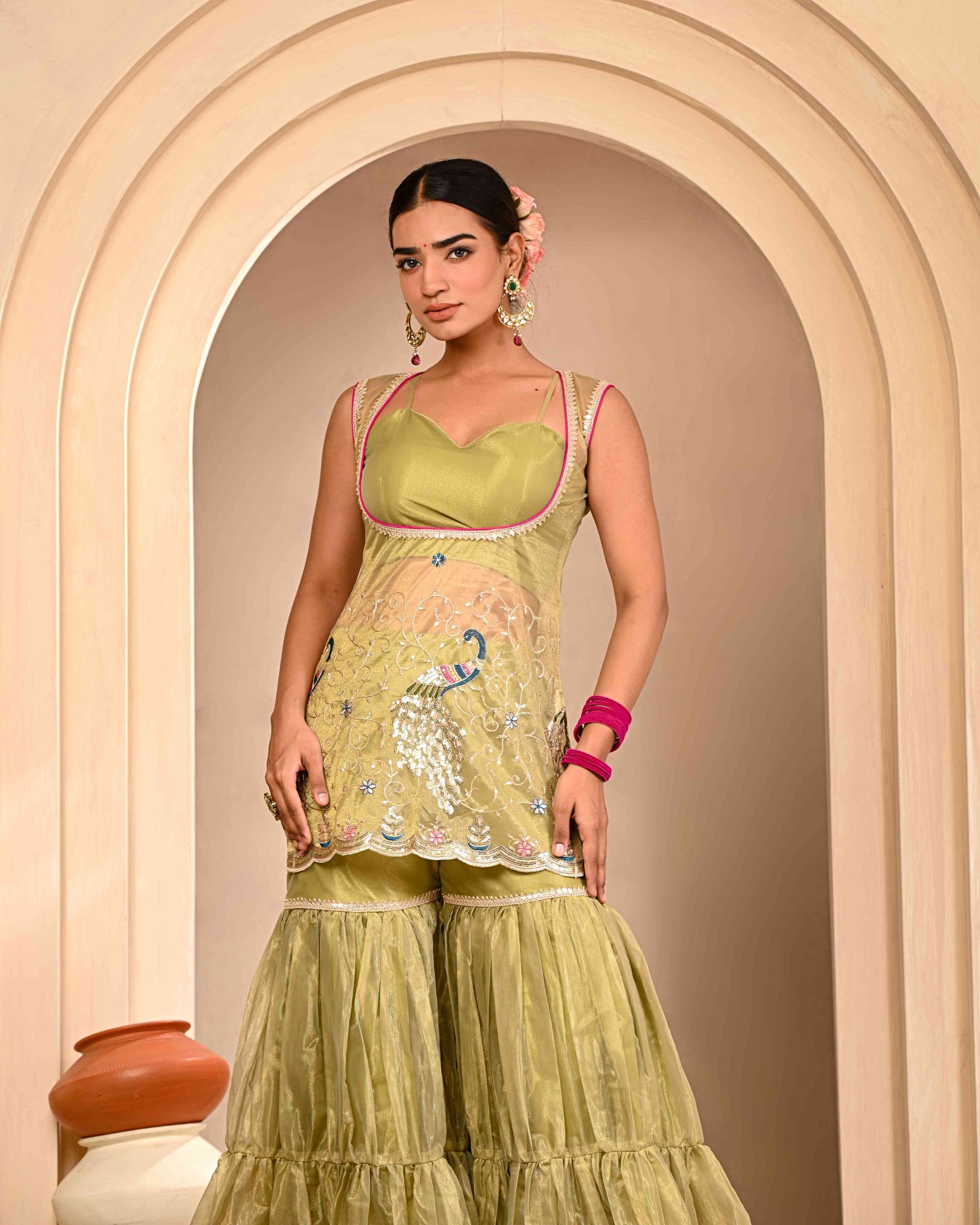 This stunning mint green sharara set features a delicately embroidered choli paired with an inner and matching dupatta, crafted entirely from exquisite cosmo net fabric. The intricate embroidery adds a touch of elegance, making it perfect for festive occasions or celebrations. Experience comfort and style combined in this beautifully designed ensemble that promises to make you stand out effortlessly.
