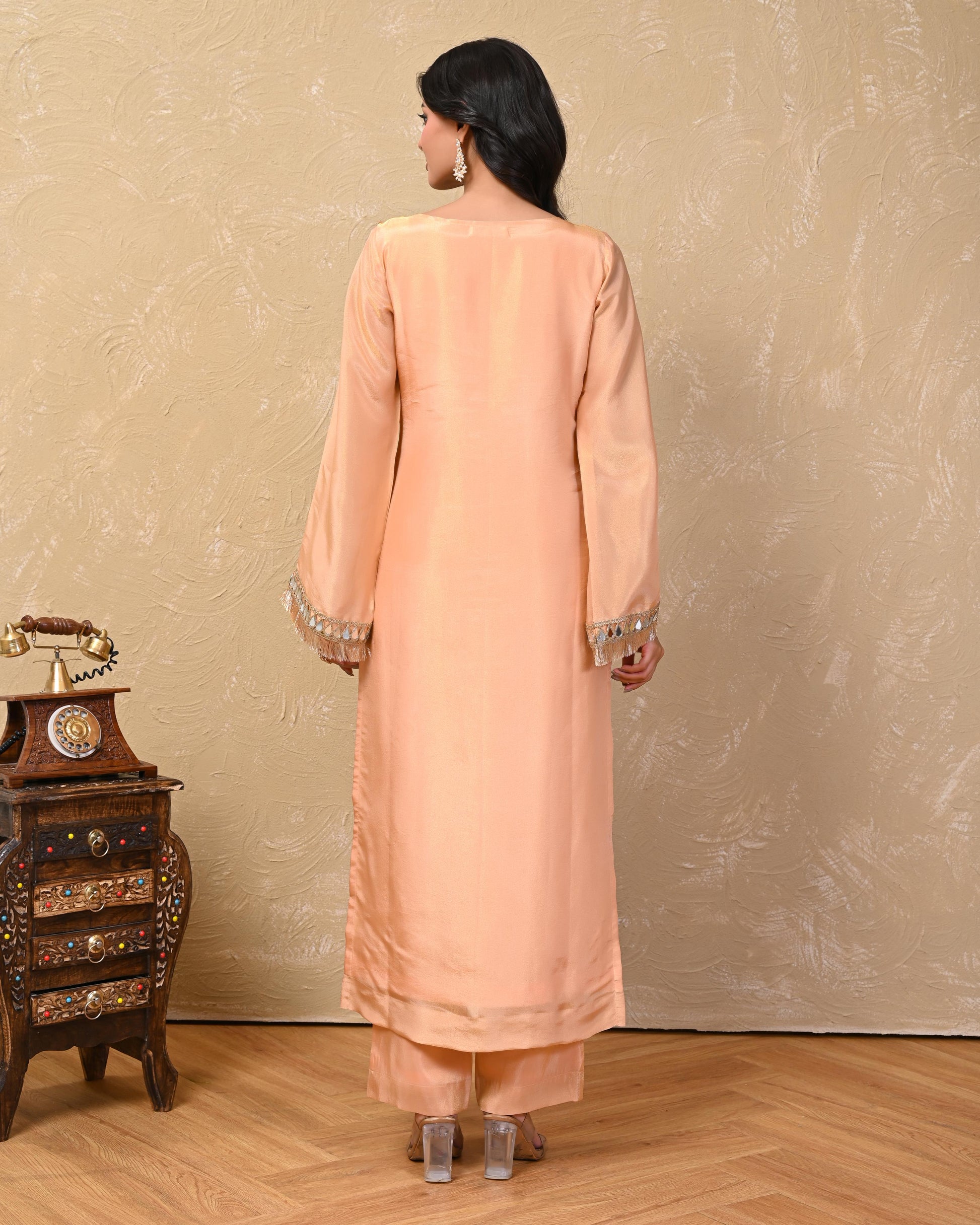 Upgrade your wardrobe with our Peach Cosmo Tissue Kurta Set. With beautiful mirrorwork details on the neckline and sleeves, and full bell sleeves for added charm. Made from comfortable and luxe fabrics, this set is perfect for any occasion. Elevate your style and experience the best in comfort and elegance.