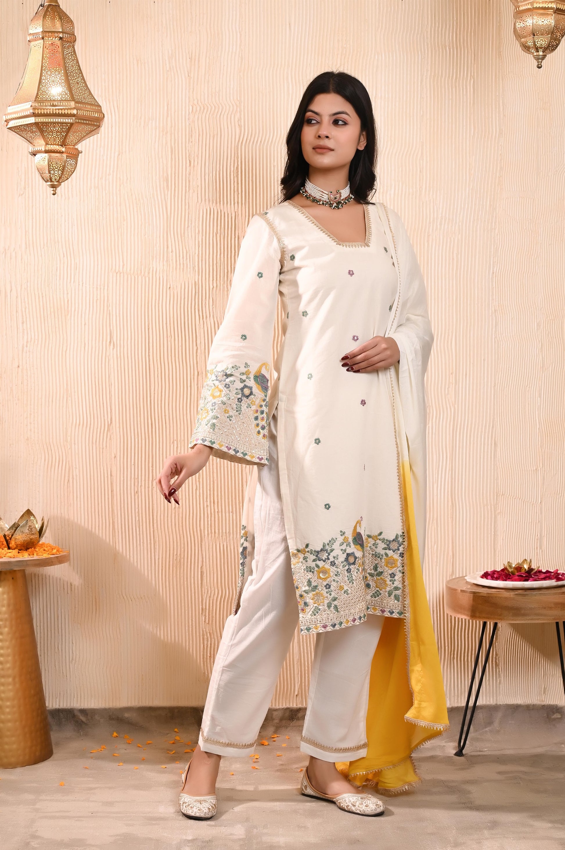 "Expertly crafted for comfort and style, our Moksha embroidered kurta set features intricate off white embroidery on high-quality cotton fabric. This set is complete with beautiful chinon dupatta, making it a versatile and elegant addition to any wardrobe."